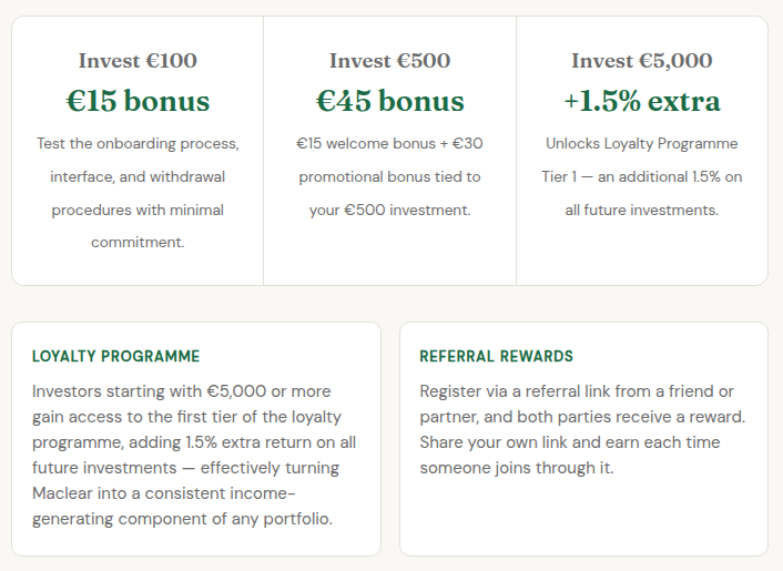 Maclear offers a comprehensive bonus programme designed to enhance early returns. Three entry points are available depending on investment size:
